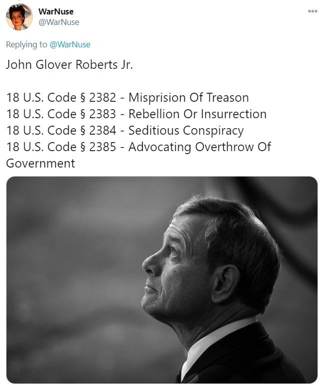 This is the part where the Justice system is failing.  Deductive reasoning is…if the Chief Justice of the Supreme Court intentionally wants to make sure President Trump is not re-elected, then the justice system is severely failing and the Mililtary can arrest and try traitors!  We need these dirty low life swamp rats to go to Tribunals!